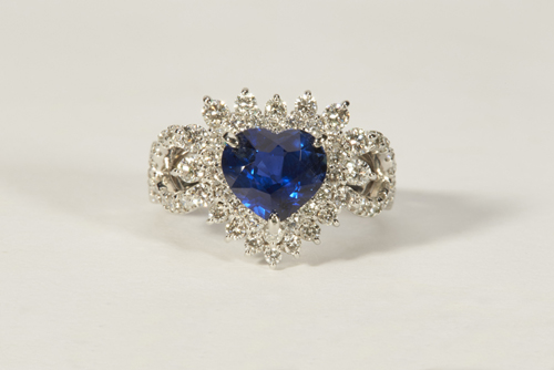 总重量9.27克。蓝宝石6.04克拉,皇家蓝色,钻石3.26克拉,18K金。