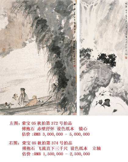 赤壁题材是傅抱石作品中比较常见的;而拍卖市场上,也以他的赤壁题材作品成交价位最高,如《赤壁图》262万、《赤壁泛舟》198万,都是非常不错的成绩。但相较他幅赤壁,此幅在更大更精确的程度上再现了东坡赋的精神原意,又把自己的情感熔铸、宣泄其中,托物言志、借绘书怀,故其价值当亦更高。